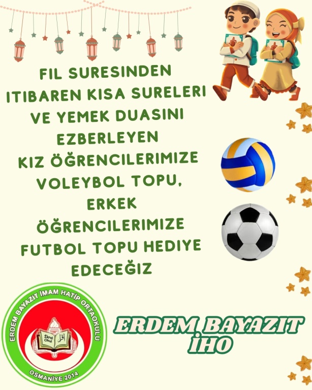 Öğrencilerimiz fil suresinden itibaren kısa sureleri ve yemek duasını ezberlerse okulumuzdan kız öğrencilerimiz voleybol erkek öğrencilerimiz futbol topunu hediye olarak alacaklar